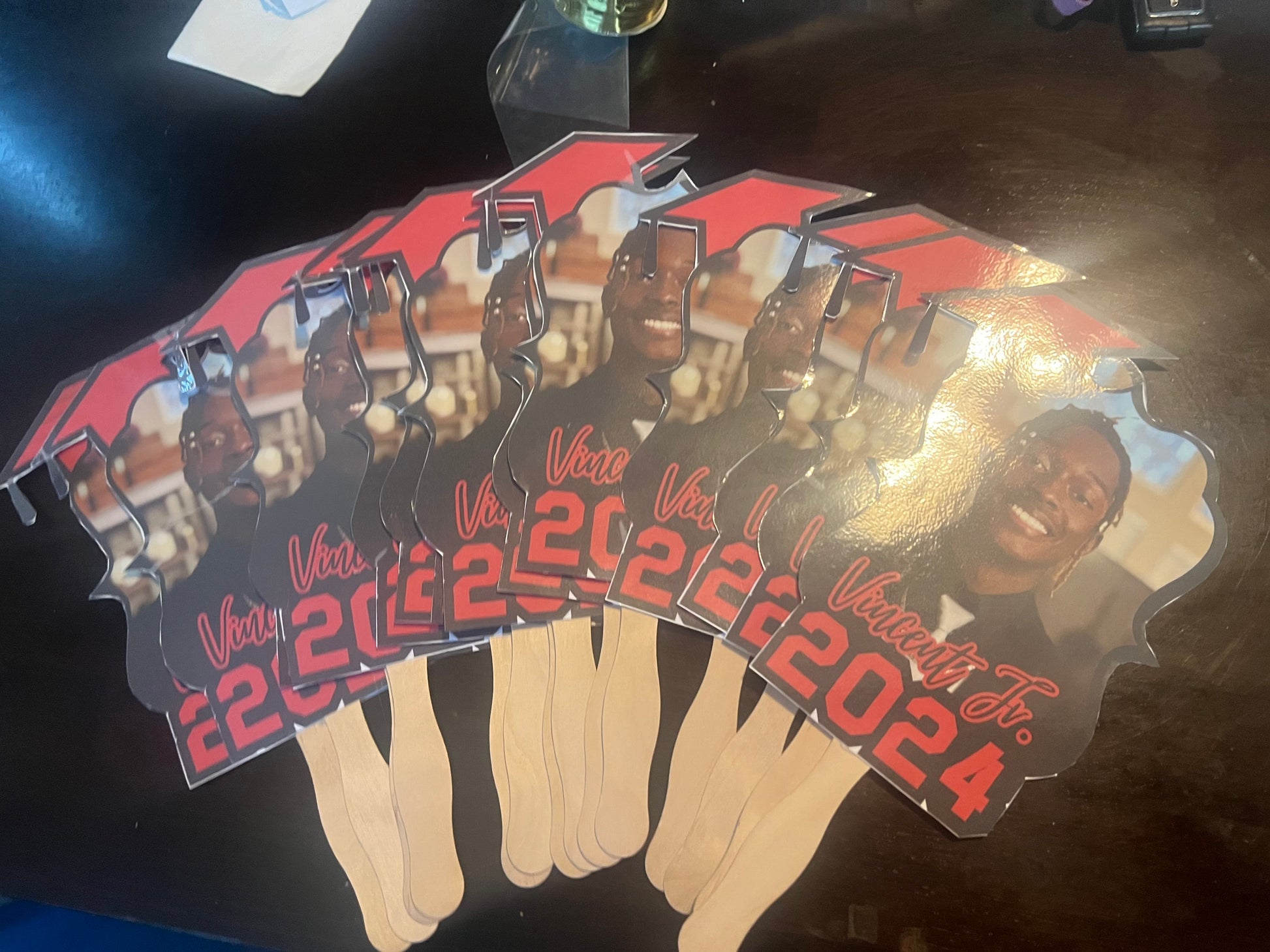 Enhance your family's graduation experience with Grad Fans. These beautifully crafted fans not only provide a cool breeze, but also make it easier for your family to stand out and support your loved one during their big day. Available in a variety of designs, Grad Fans are the perfect accessory for any graduation ceremony.